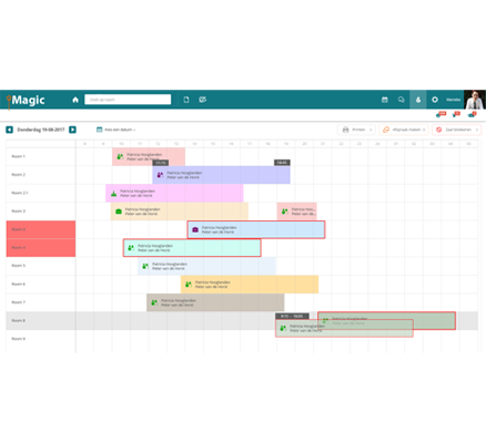 AgendaDeze agenda geeft u de flexibiliteit die u nodig heeft. Bekijk uw bezetting per maand of per dag en beheer uw zalen. Sleep een evenement naar een andere zaal of blokkeer een zaal.