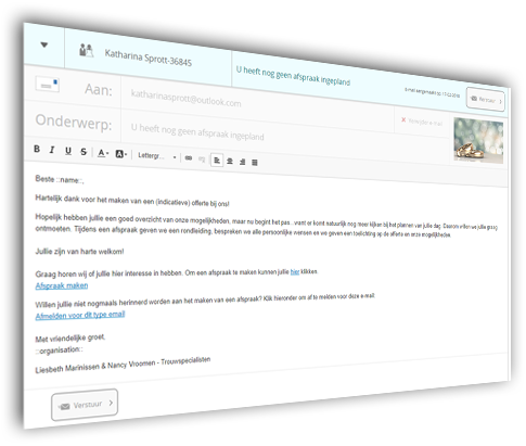 KlantenbeheerUw klantenbeheer was nog nooit zo op orde én automatisch. Van jaarlijkse herinneringen op trouwdagen, fotos van uw klanten (die ze zelf uploaden), tot auqisitie en terugbel-acties.