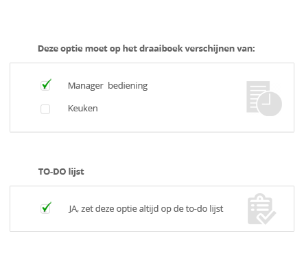 To-do lijstenNooit meer iets vergeten! Zet taken handmatig op uw planning en creëer automatisch to-do lijsten voor elk event. Gekozen opties komen ook direct op uw to-do lijst komen te staan (indien nodig).