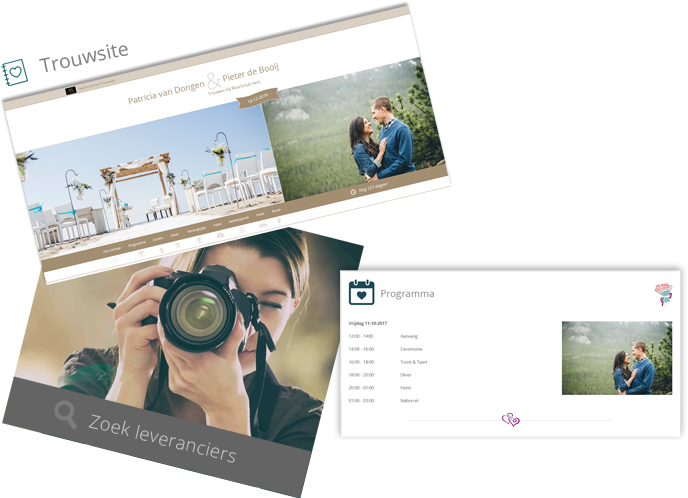 Geef uw bruidsparen de mogelijkheid om alles online te regelen in uw eigen (white label) omgeving. Leveranciers, gastenlijst, to-do lijsten, dieetwensen en zelfs een eigen trouwsite (met routebeschrijving, programma etc).
